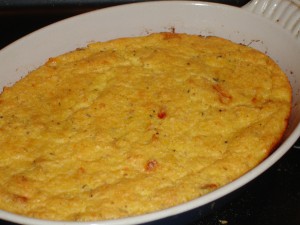 Optional: You can also add bits of cooked bacon, ham, roasted peppers or green onions to this, but keep the pieces small so the mixture is able to rise with the egg whites. I have also used “toasted” grits but I am not fond of the popcorn flavor and additional grit texture for this recipe. You can substitute cornstarch for the flour in this recipe. Remember that cornstarch has double the holding power of flour so cut back a bit. You can make a half batch of this recipe just as well (which is what you see in the photo).